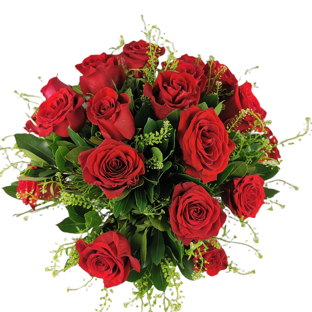 Βαθύ κόκκινο τριαντάφυλλο του πάθους με υπέροχες πρασινάδες. Το μπουκέτο μπορεί να διαφέρει ελαφρώς από τη φυτογραφία ανάλογά με την εποχή και τη διαθεσιμότητα.