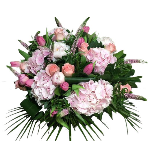 Παλ ορτανσίες με βερόνικες, τουλίπες, τριαντάφυλλα και πρασινάδες συνθέτουν ένα άρτιο μπουκέτο. Το μπουκέτο μπορεί να διαφέρει ελαφρώς από τη φυτογραφία ανάλογά με την εποχή και τη διαθεσιμότητα.