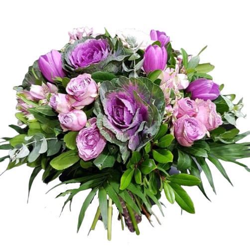 Dreamy purple Tulips with minion purple Roses and unsurpassed Brassicas compose the purple dream. The size of the bouquet in the picture is Medium. The bouquet may differ slightly from the photo depending on the season and availability.